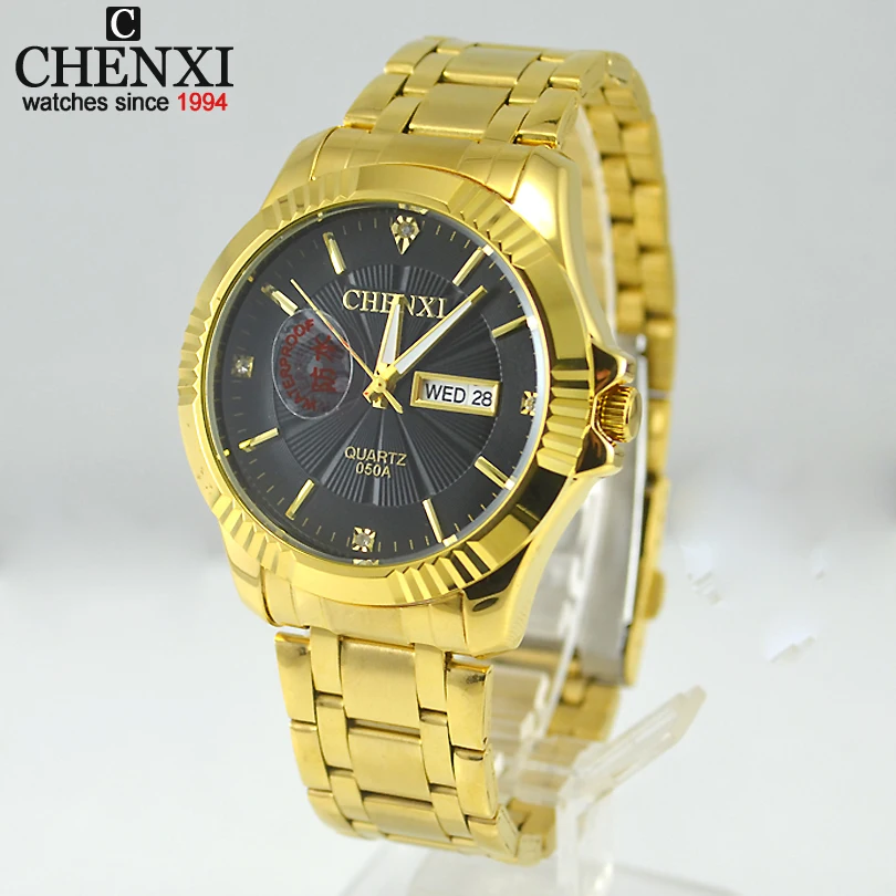 Discount for CX050 L Size High Quality Gold Watch Stainless Full Steel Men Wristwatch Week Date Male Quartz Watches Fashion New Free Shipping ?