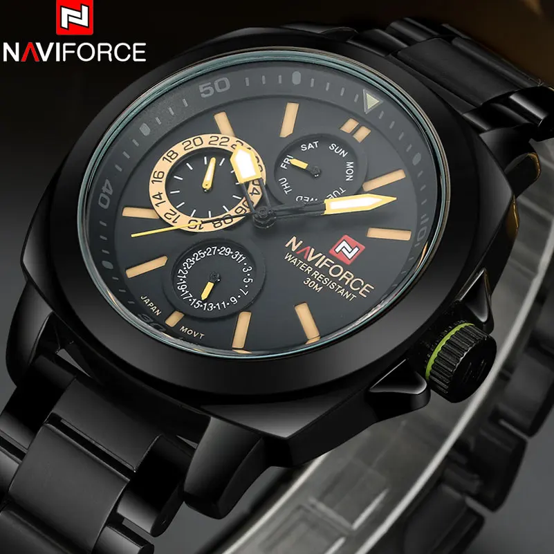 2016 New NAVIFORCE China brand Luxury watches men 12/24 auto date quartz watch week month black yellow full steel band clock Description