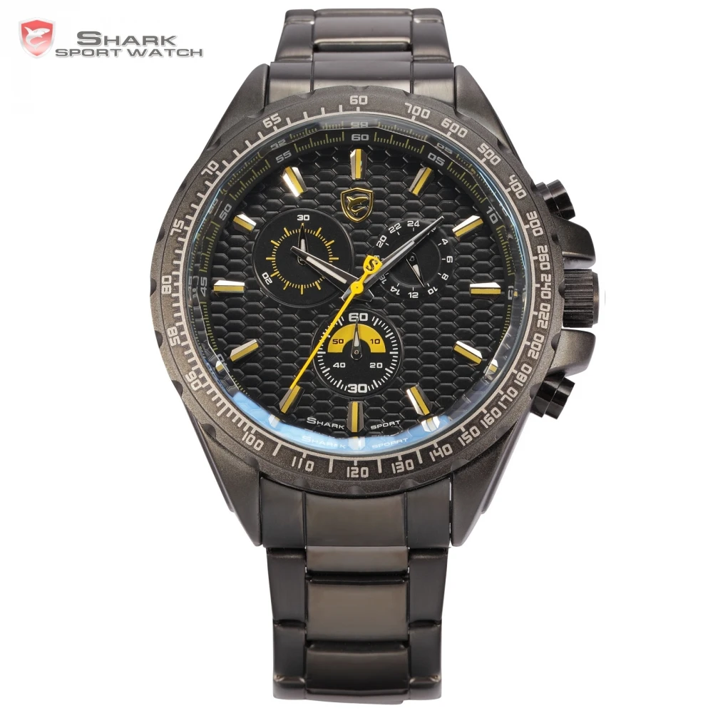 Steel Frilled Shark Sport Watch Chronograph 24 Hours Black Yellow Dial Stainless Steel Band Mens Outdoor Wristwatch Gift / SH190 Description