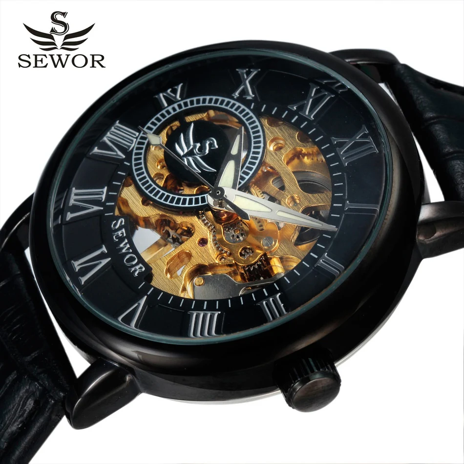 Main Features : SEWOR Top Brand Black Skeleton Mechanical Watch Men Leather Wristwatches Casual Watches Clock Montre Homme Relogio Masculino