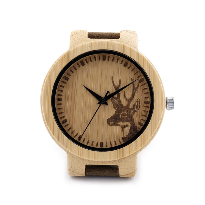 BOBO BIRD D14 Engraved Deer Wooden Watch Mens Quartz Japan Movement Wristwatch with Leather Strap Description