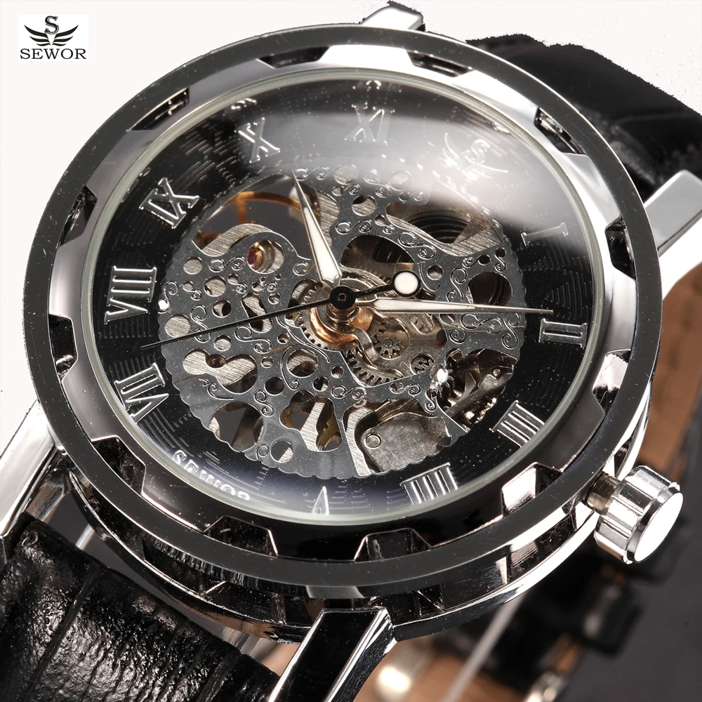 SEWOR Luxury Brand Skeleton Watches Mechanical Hand Wind Wristwatch Leather Strap Classic Relogio Masculino Men Fashion Watch Description