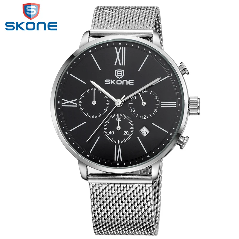 Main Features : SKONE Watch Men Stainless Steel Mesh Montre Homme Calendar Watches for Men Multifunction Mens Wristwatches Relogio Masculino